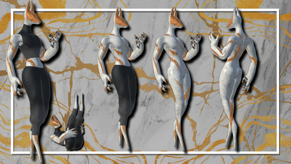 A jackal, marble stone and gold creature! I'll do a write up of the species when I have some more time! But for now they are just chill, pretty, but reserved. They don't express that much ;p Being a stone Golem of sorts leaves you feeling pretty rigid. They are calm, cool, collected, and graceful. But once you get to know them, they have the dryest silly humor!